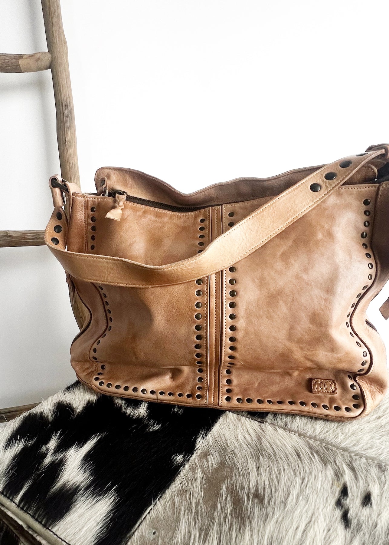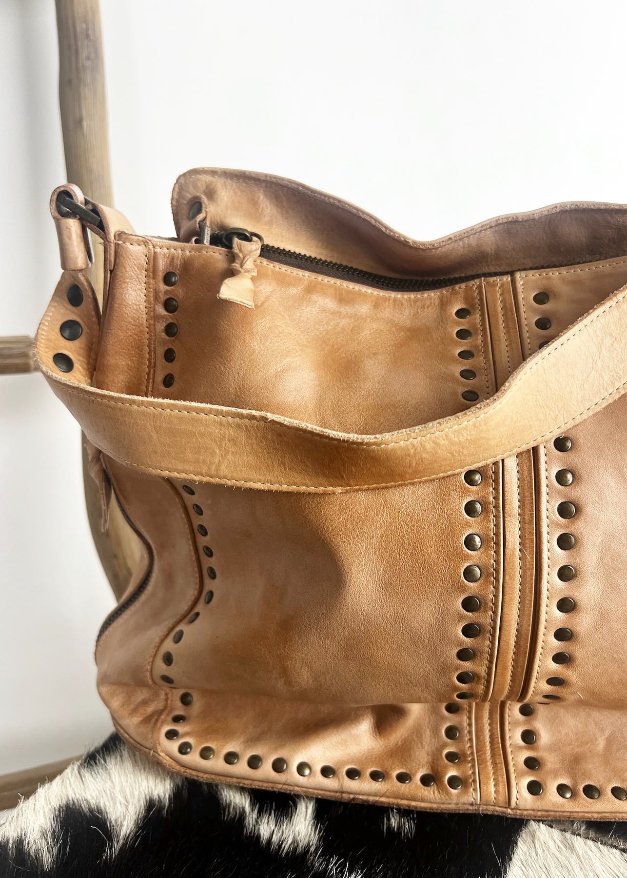 - Shoulder tote bag with stud details and feet to stand upright, zip top closure