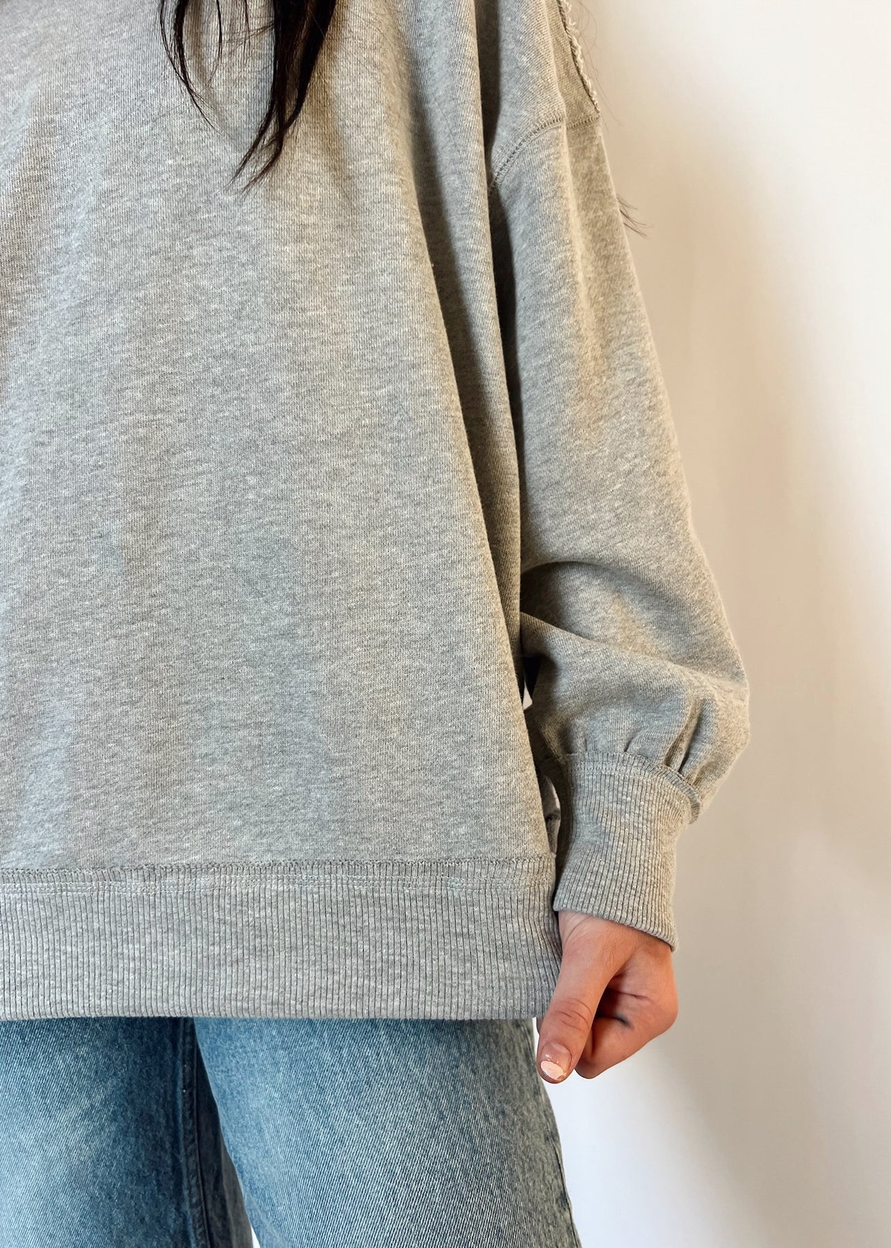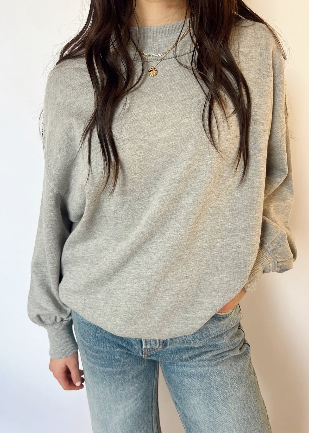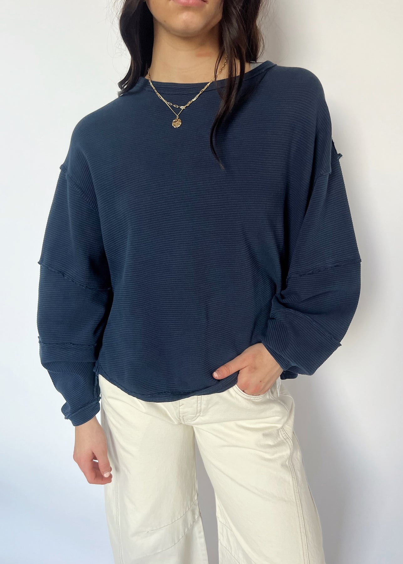 Features: French terry fabrication, mock neckline, drop-shoulder long sleeves, ribbed trim, exposed seams