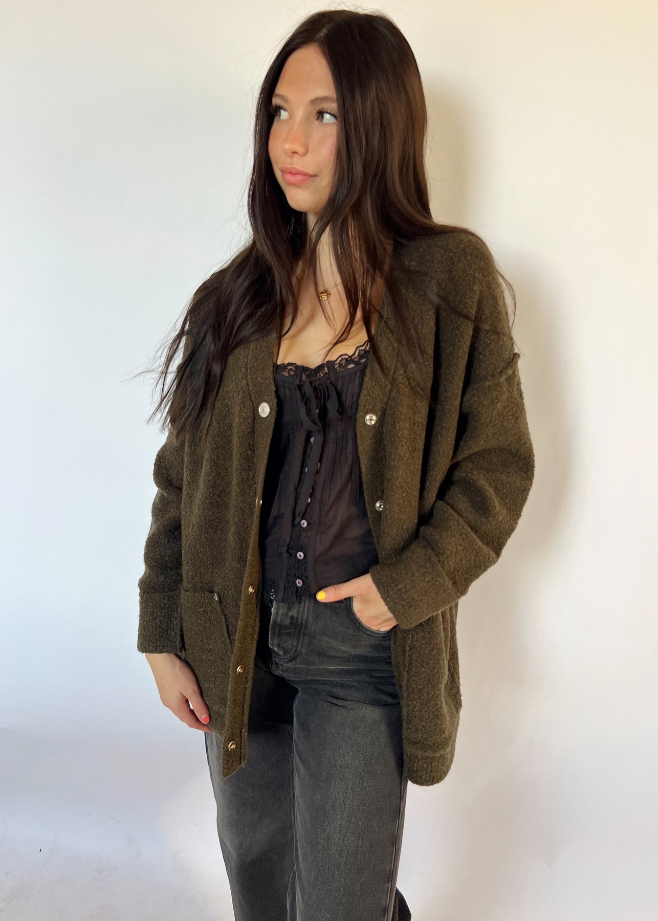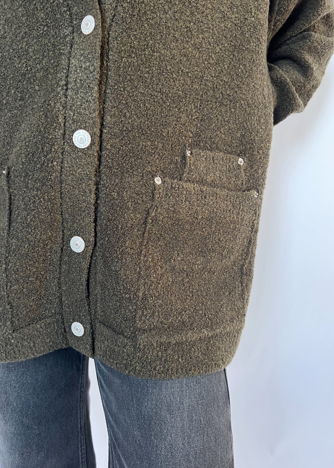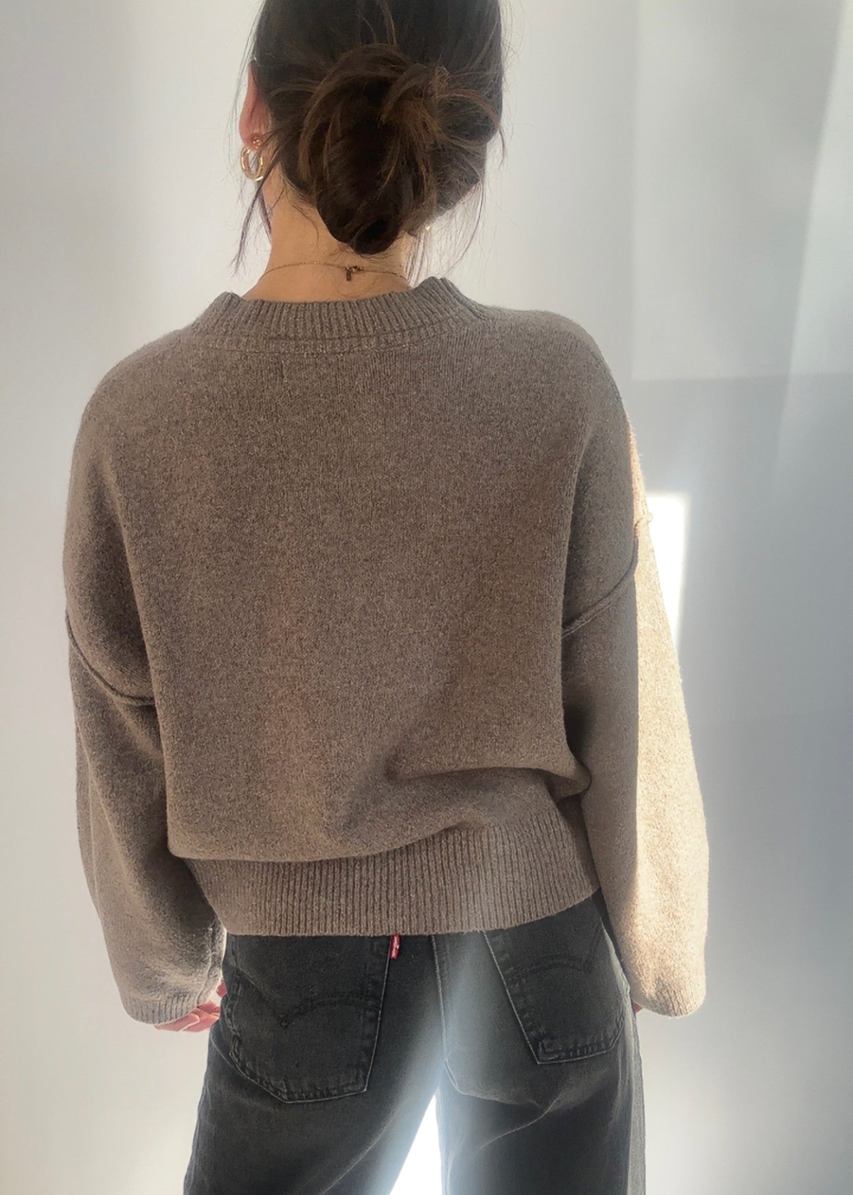 Features: French terry fabrication, mock neckline, drop-shoulder long sleeves, ribbed trim, exposed seams