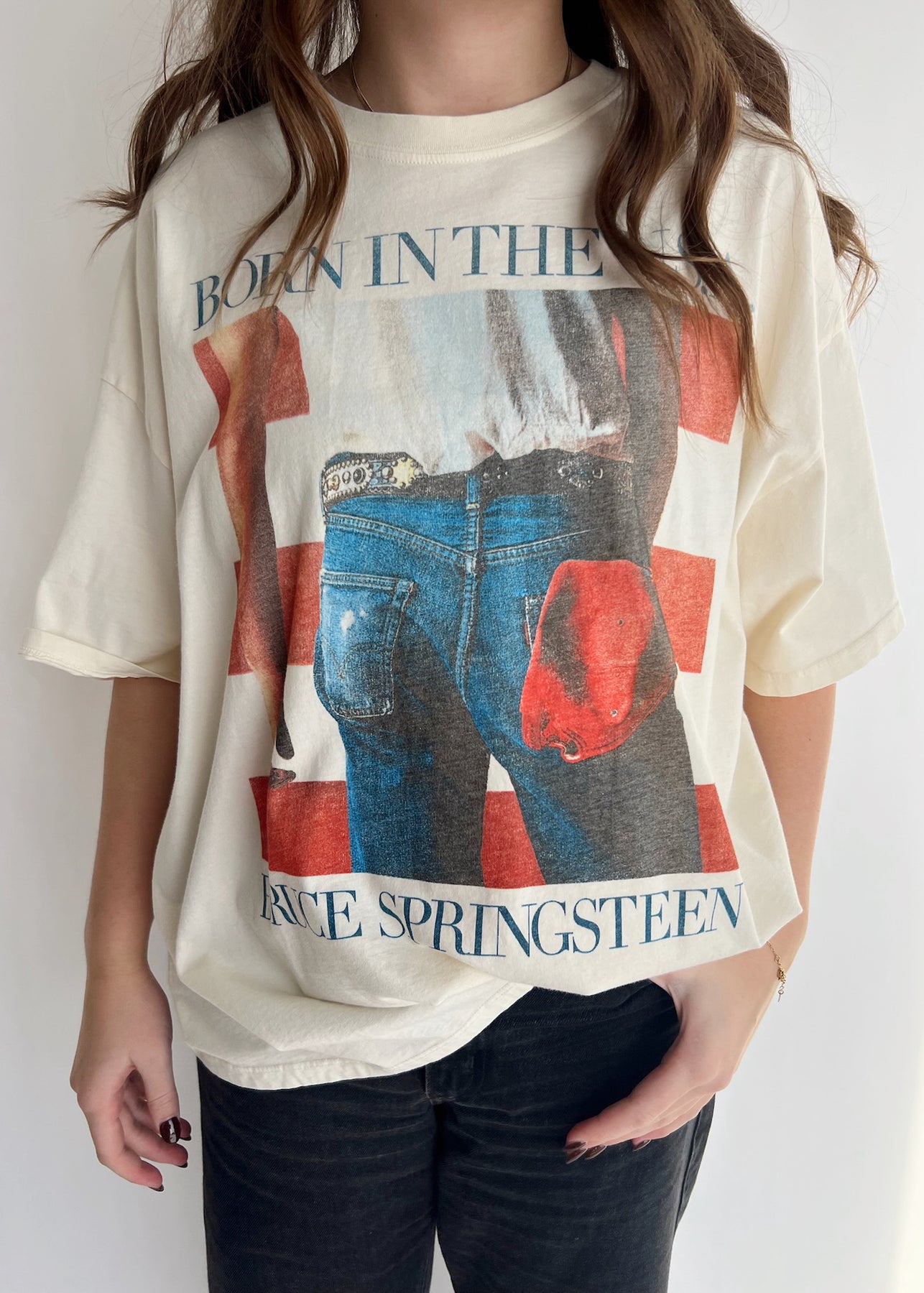 Just as cool as it is classic, this timeless tee is featured in an oversized, slouchy fit with scoop neckline, dropped sleeves, and worn Bruce Springsteen graphics throughout for a true lived-in look.