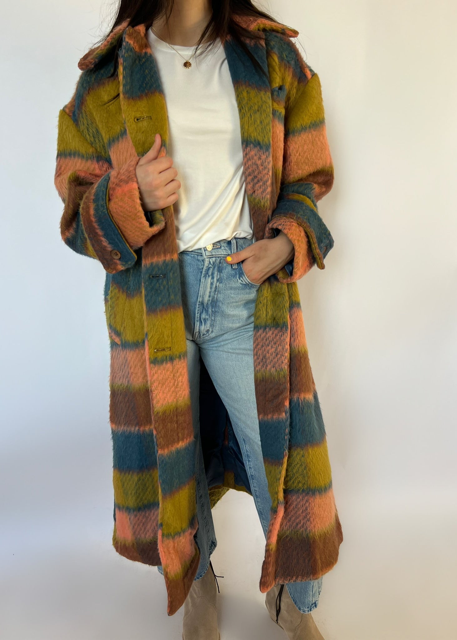 Bring a cozy edge to your outerwear collection with this longline coat, featured in a soft wool fabrication and single-breasted design, finished with a bold print and an attached scarf for an added touch.