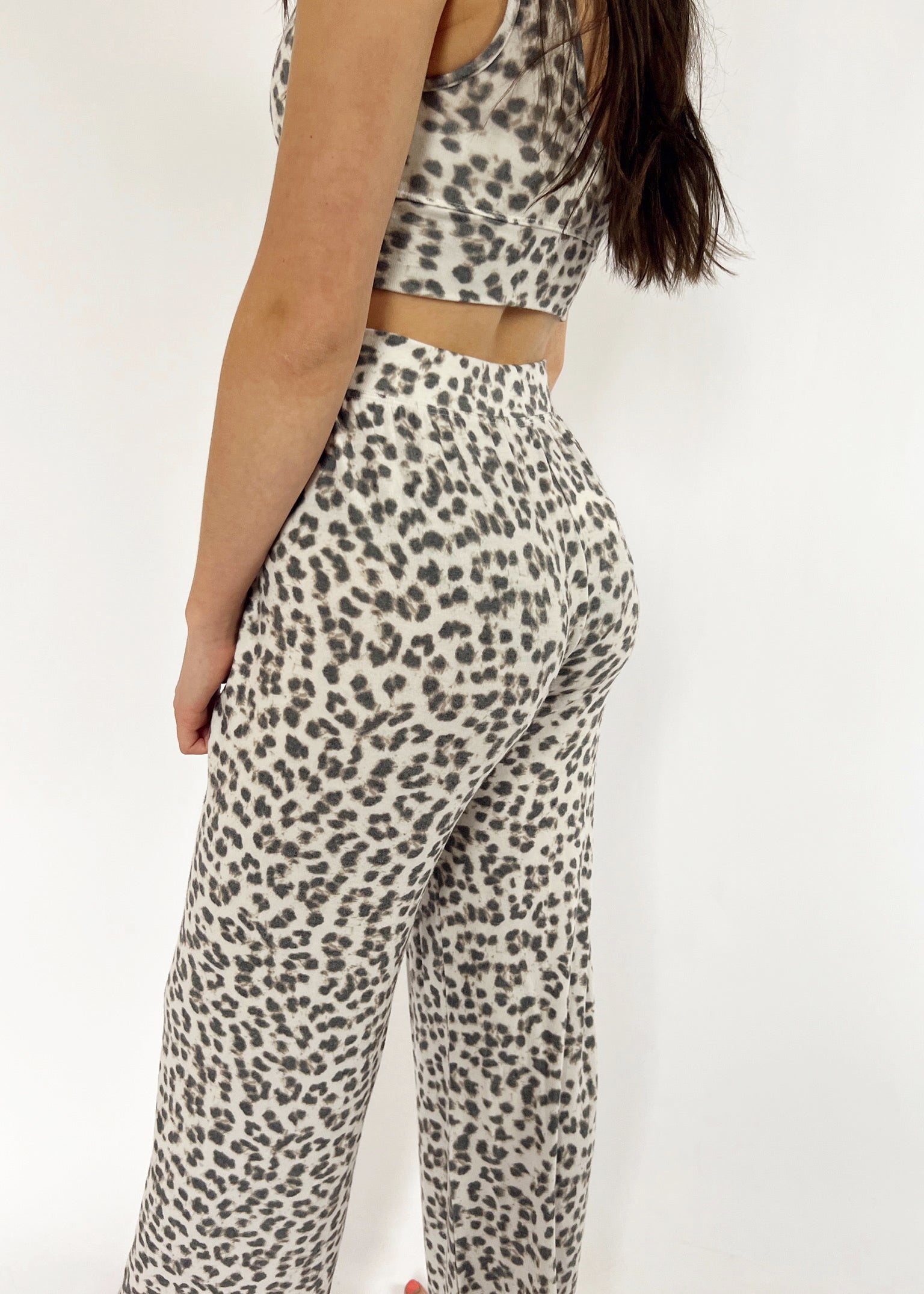 Laid-back, a little wild, and seriously soft. With a relaxed fit, elastic waistband, and allover leopard print, these brushed knit pants are made for lounging in style.