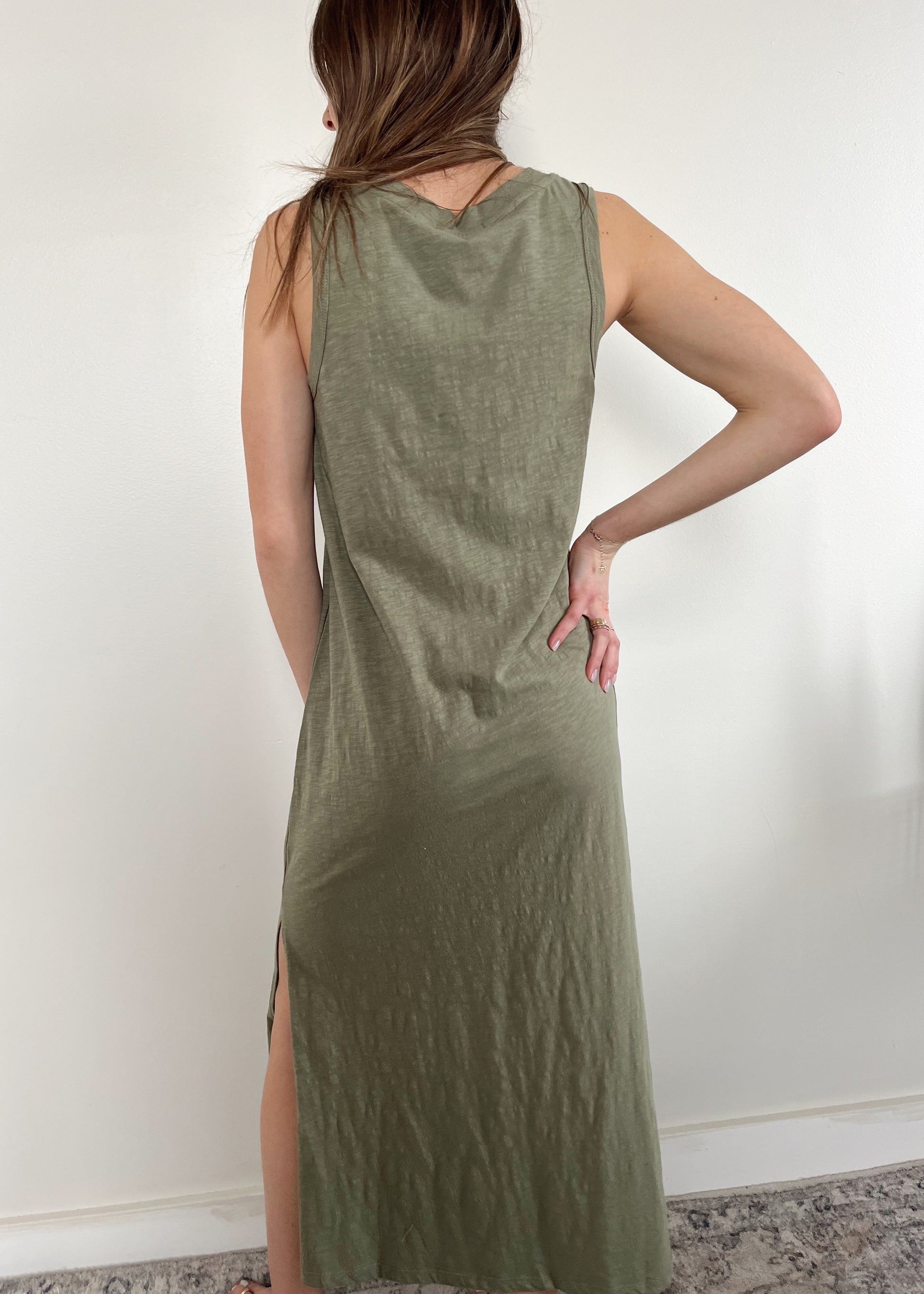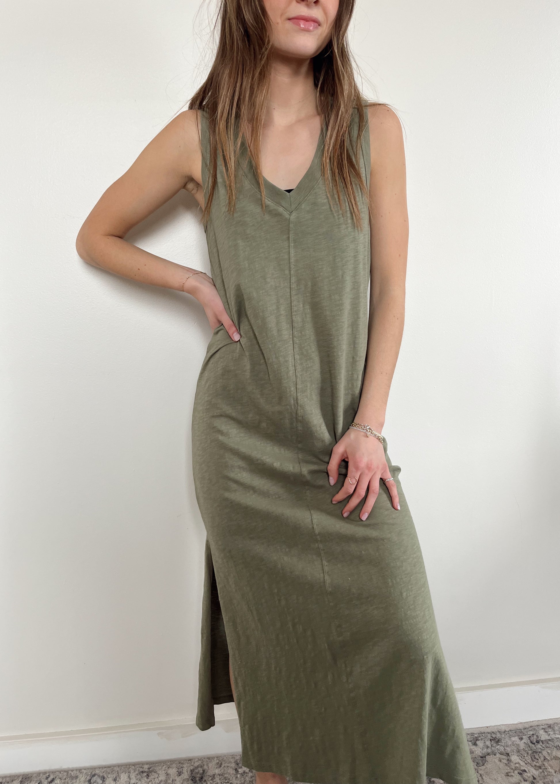 Classic v-neck midi dress in four colours! So easy to pack and take on a vacation. Wear it to the beach or out for dinner! The dress that does it all!